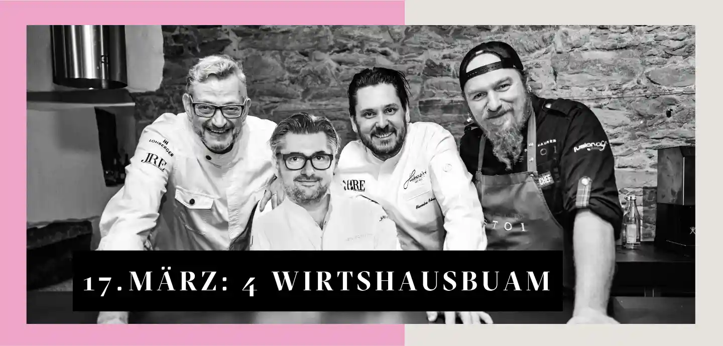 Wenn perfektes Handwerk, großes Talent und grenzenlose Leidenschaft, gewürzt mit einer ordentlichen Prise Lachen und Humor, aufeinandertreffen, entstehen unvergessliche Erlebnisse sowie Menüs der Spitzenklasse! Die Wirtshausbuam, bestehend aus Anton Schmaus, Alexander Huber, Lucki Maurer und Jockl Kaiser, sind Garanten für echten, unverfälschten Genuss. Sie zaubern an diesem Abend mit acht Händen (und noch vielen mehr) ein einzigartiges 12-Gang-Menü, jeder präsentiert sich und seine Küche mit jeweils drei Signature Dishes!